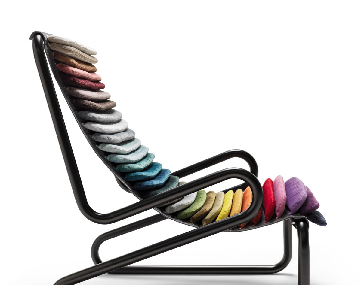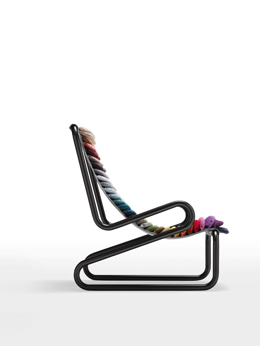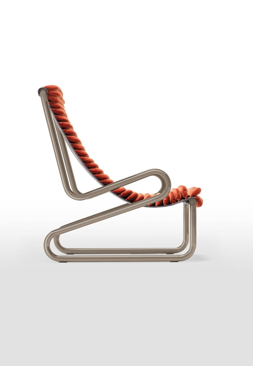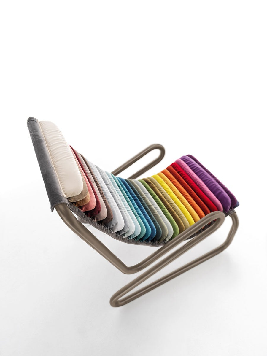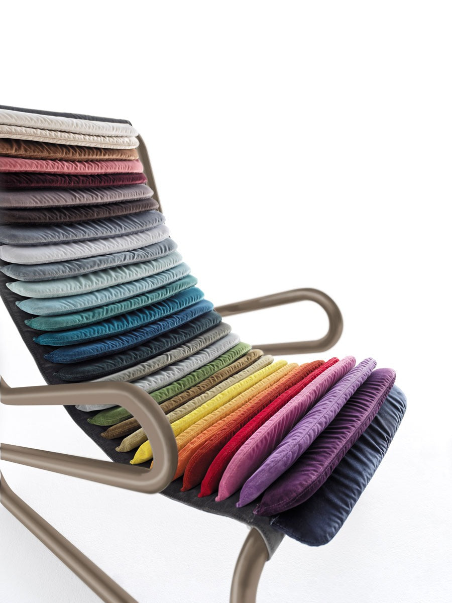 Anima di questa icona è la struttura tubolare metallica ricurva, coperta da soffici cuscinetti dalla lavorazione artigianale che disegnano la linea della seduta.