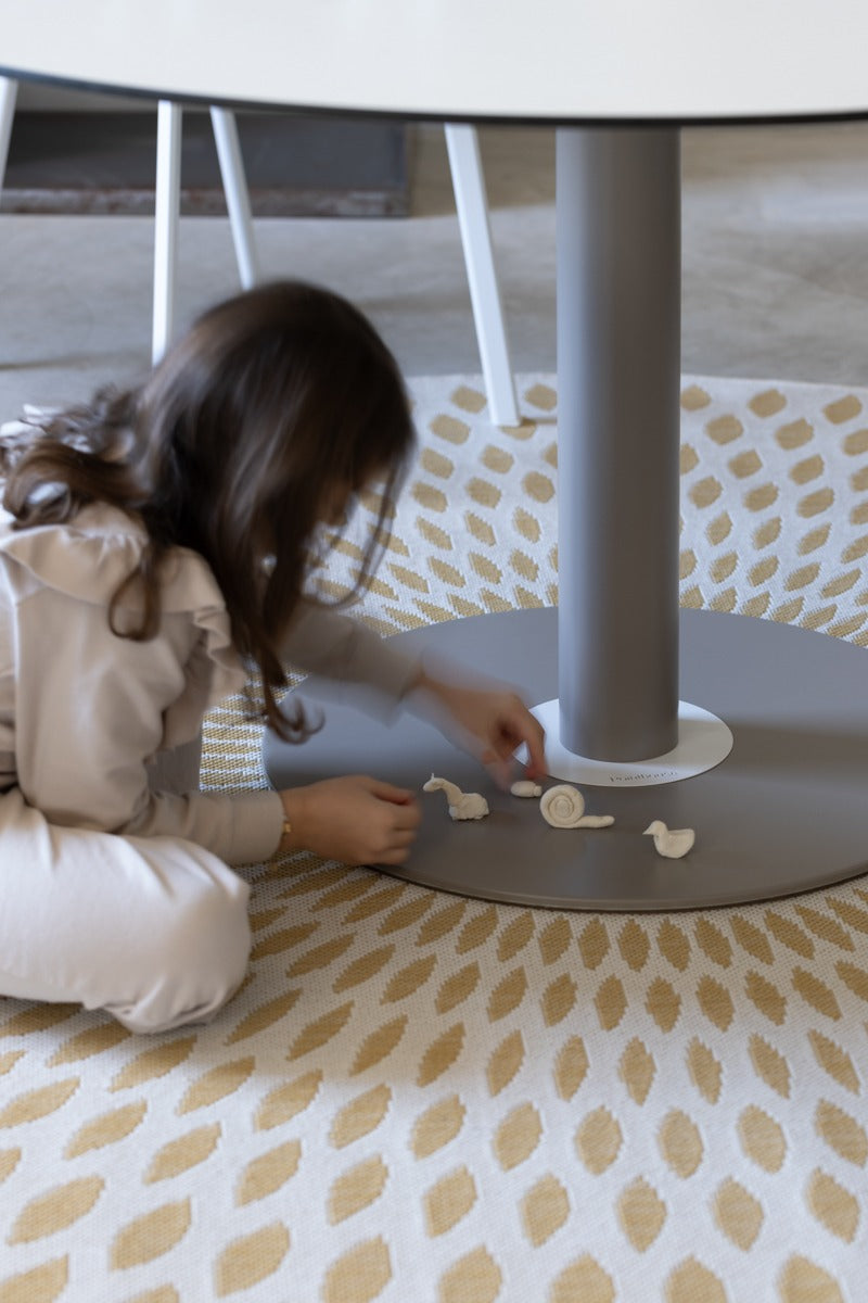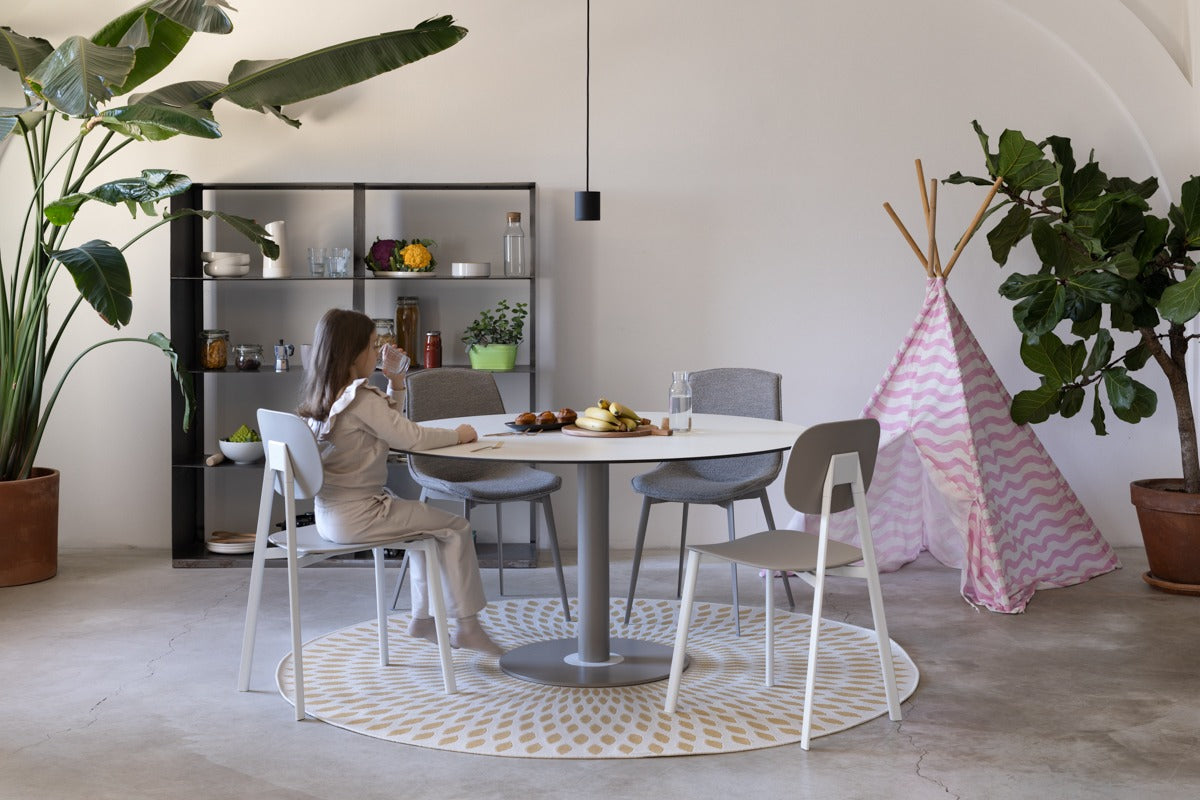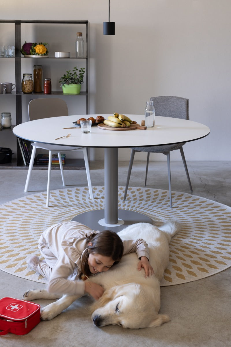 Tavolo con basamento a colonna centrale e base piatta circolare. Sulla base un anello in 3 diverse colorazioni marchiato Pointhouse. Disponibile con top in finitura Cleaf e per ordini superiori a 25 pezzi anche in HPL per uso esterno e melamminico.