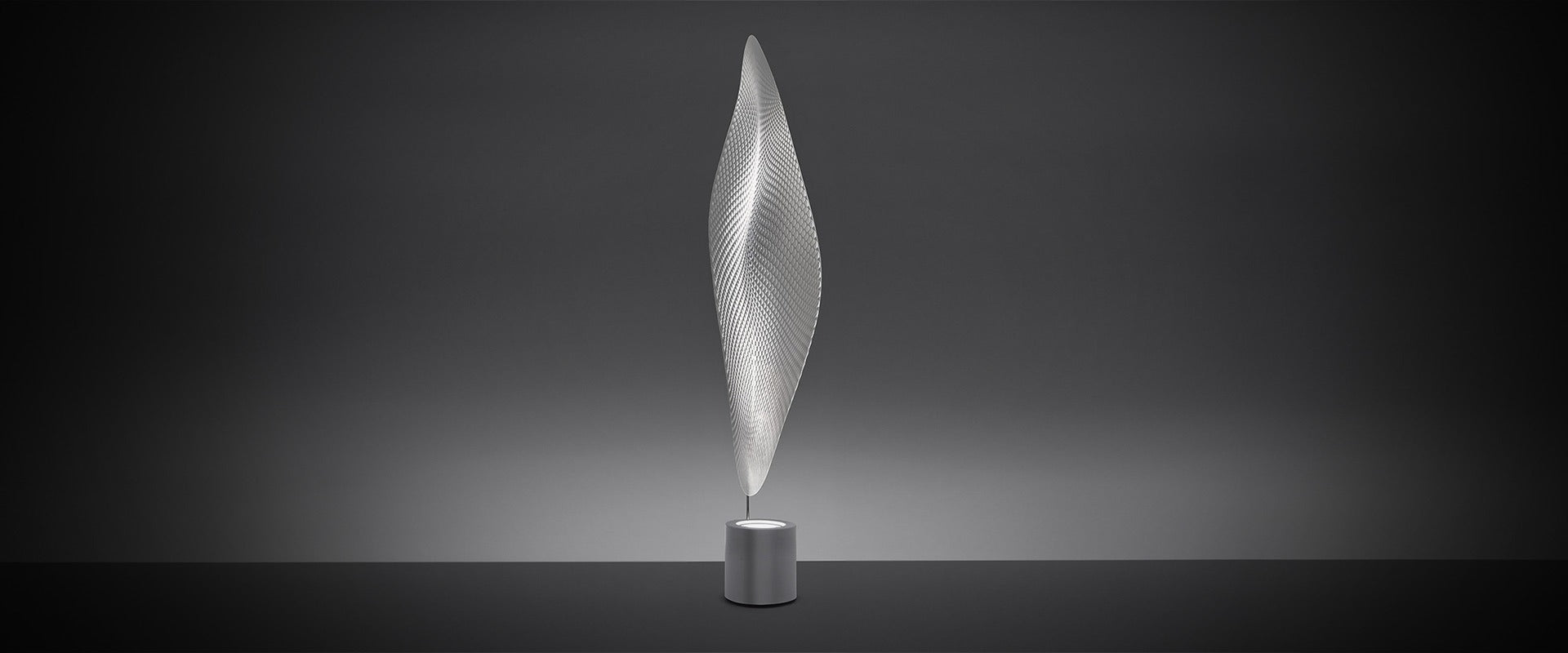 Si presenta come una foglia digitale proveniente da un altro Mondo, ricoperta di squame come un rettile o un insetto che raccoglie luce e ombra sul suo corpo per sedurre la compagna.” Materiali: struttura in acciaio cromato; corpo lampada-diffusore in metacrilato trasparente texturizzato; corpo illuminante in metallo verniciato.