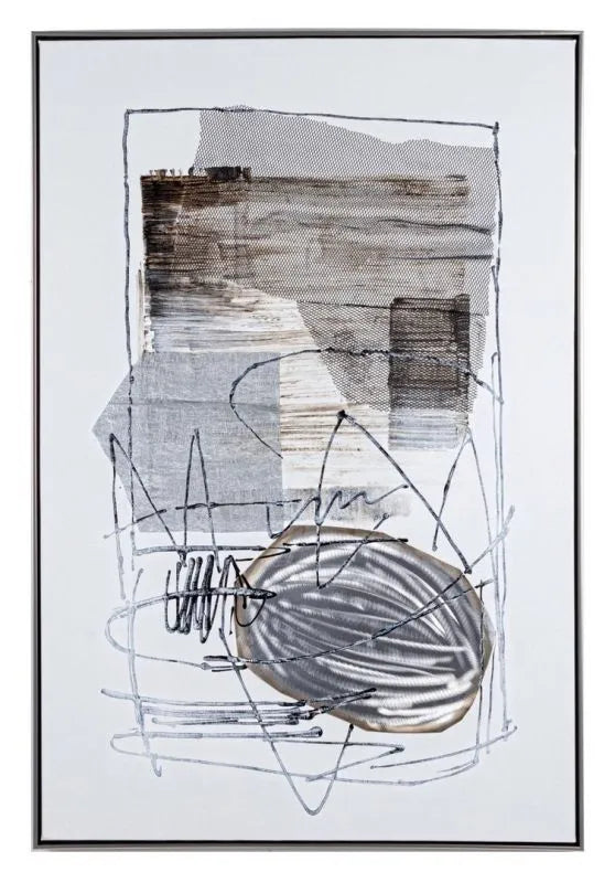 DIPINTO SU TELA CON APPLICAZIONI METALLICHE, STRUTTURA IN LEGNO DI ABETE. CORNICE IN PLASTICA.