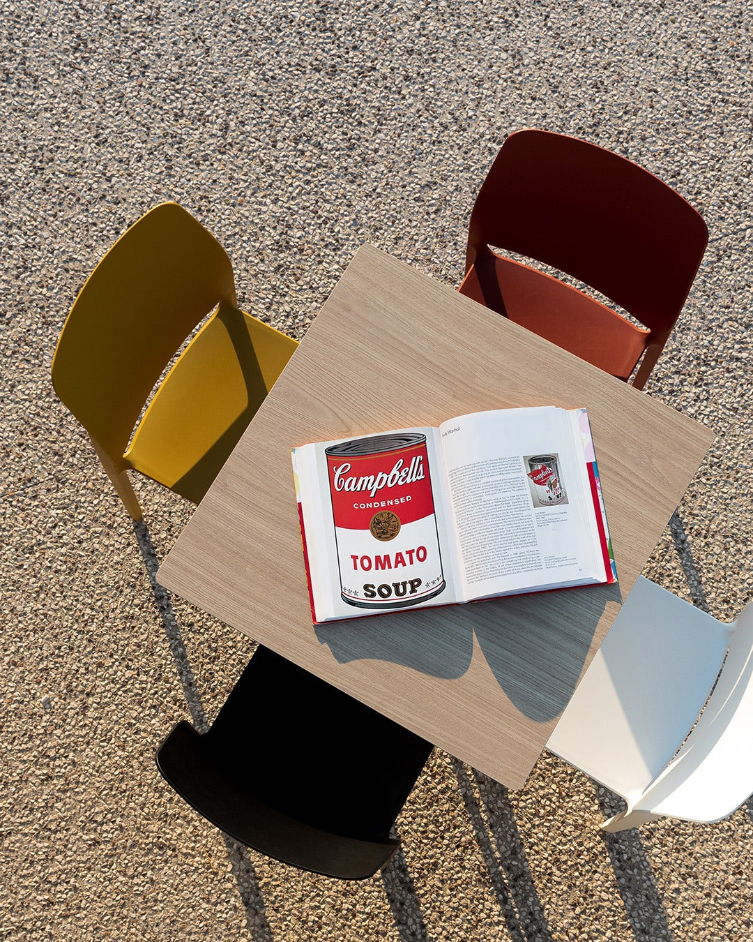 Tavolo con basamento a colonna centrale e base piatta circolare. Sulla base un anello in 3 diverse colorazioni marchiato Pointhouse. Disponibile con top in finitura Cleaf e per ordini superiori a 25 pezzi anche in HPL per uso esterno e melamminico. Piano Cleaf sp. 18 mm sbancato e bordato; piano HPL sp. 10 mm.