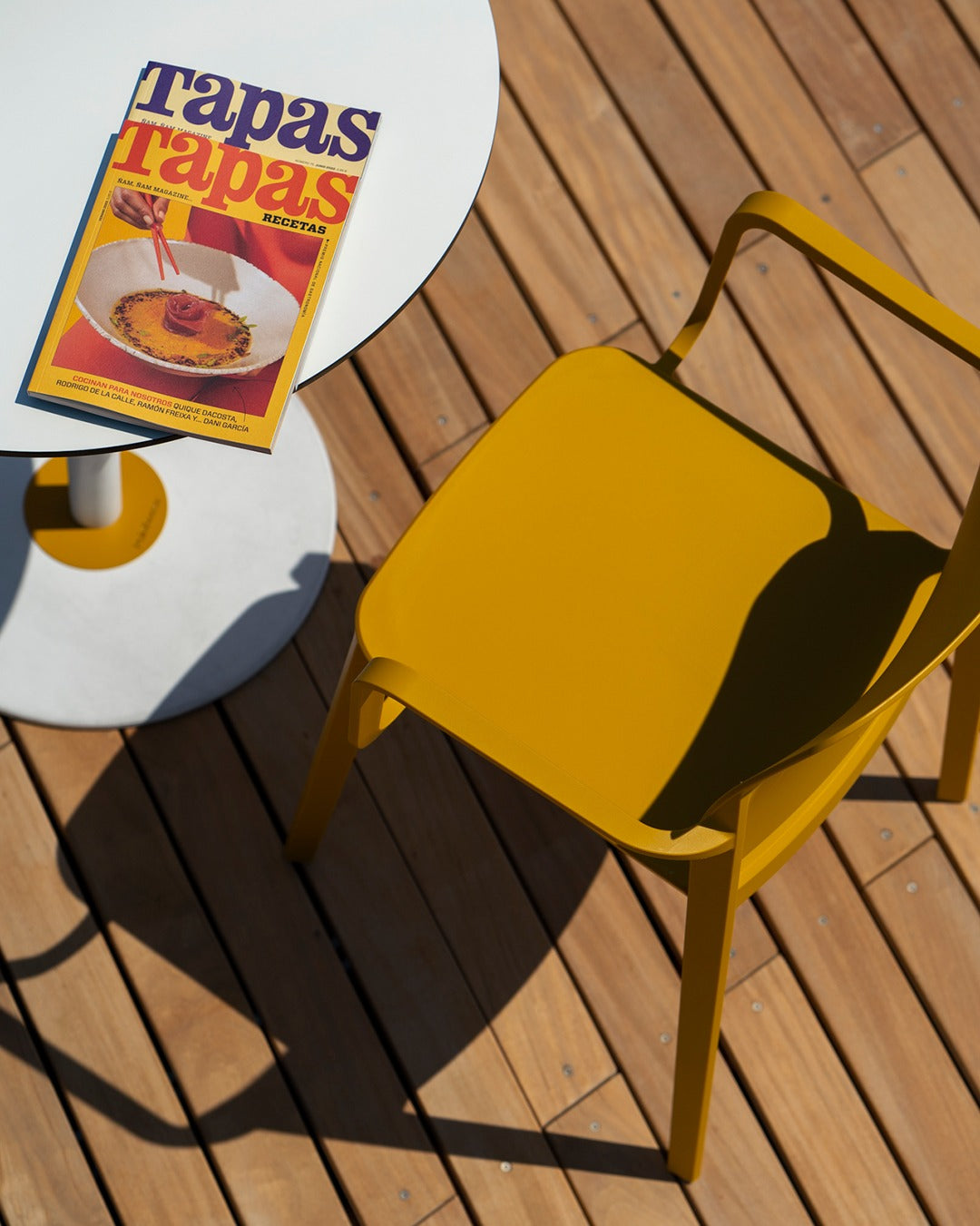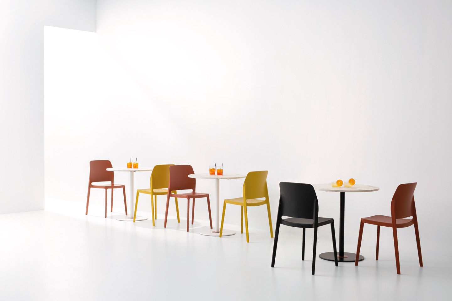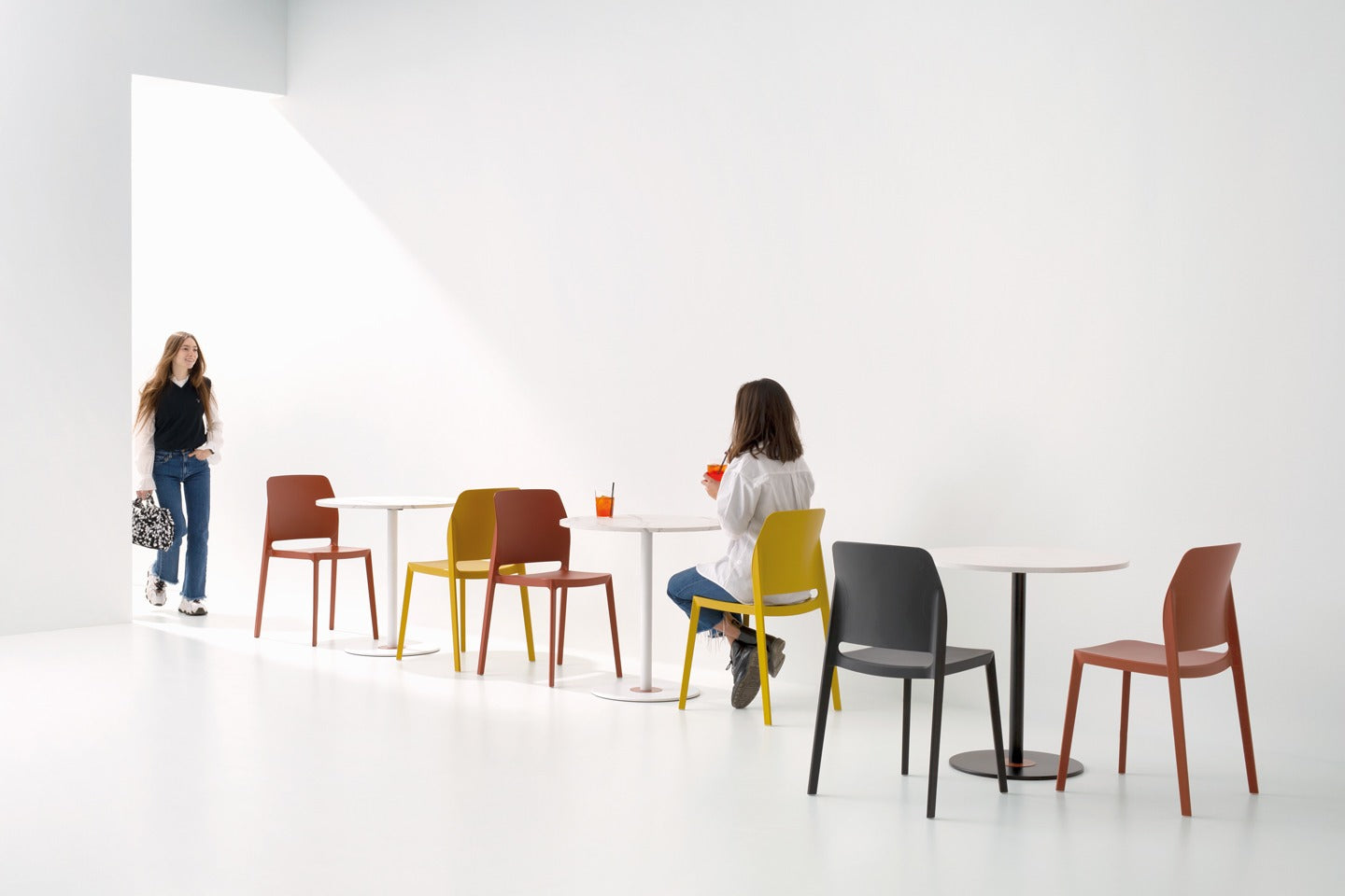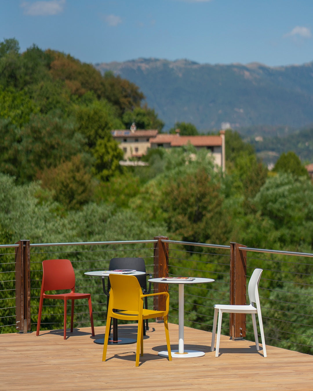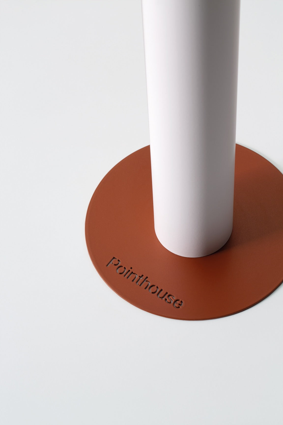 Tavolo con basamento a colonna centrale e base piatta circolare. Sulla base un anello in 3 diverse colorazioni marchiato Pointhouse. Disponibile con top in finitura Cleaf e per ordini superiori a 25 pezzi anche in HPL per uso esterno e melamminico. Piano Cleaf sp. 18 mm bordato; piano HPL sp. 10 mm.