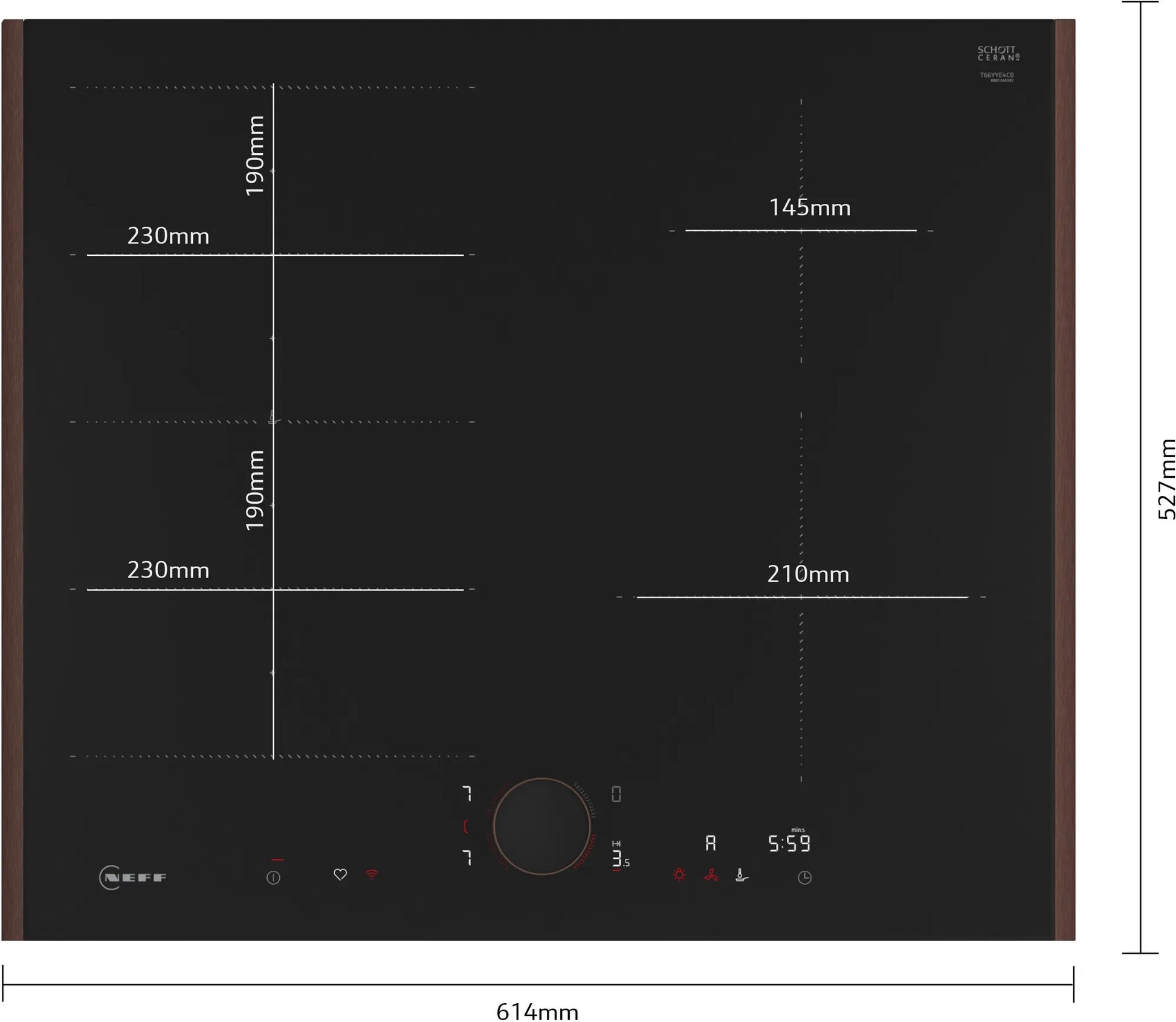 Dimensioni delle zone di cottura - 2 x (19,0 x 23,0 cm), 1 x (14,5 cm Ø), 1 x (21,0 cm Ø)
