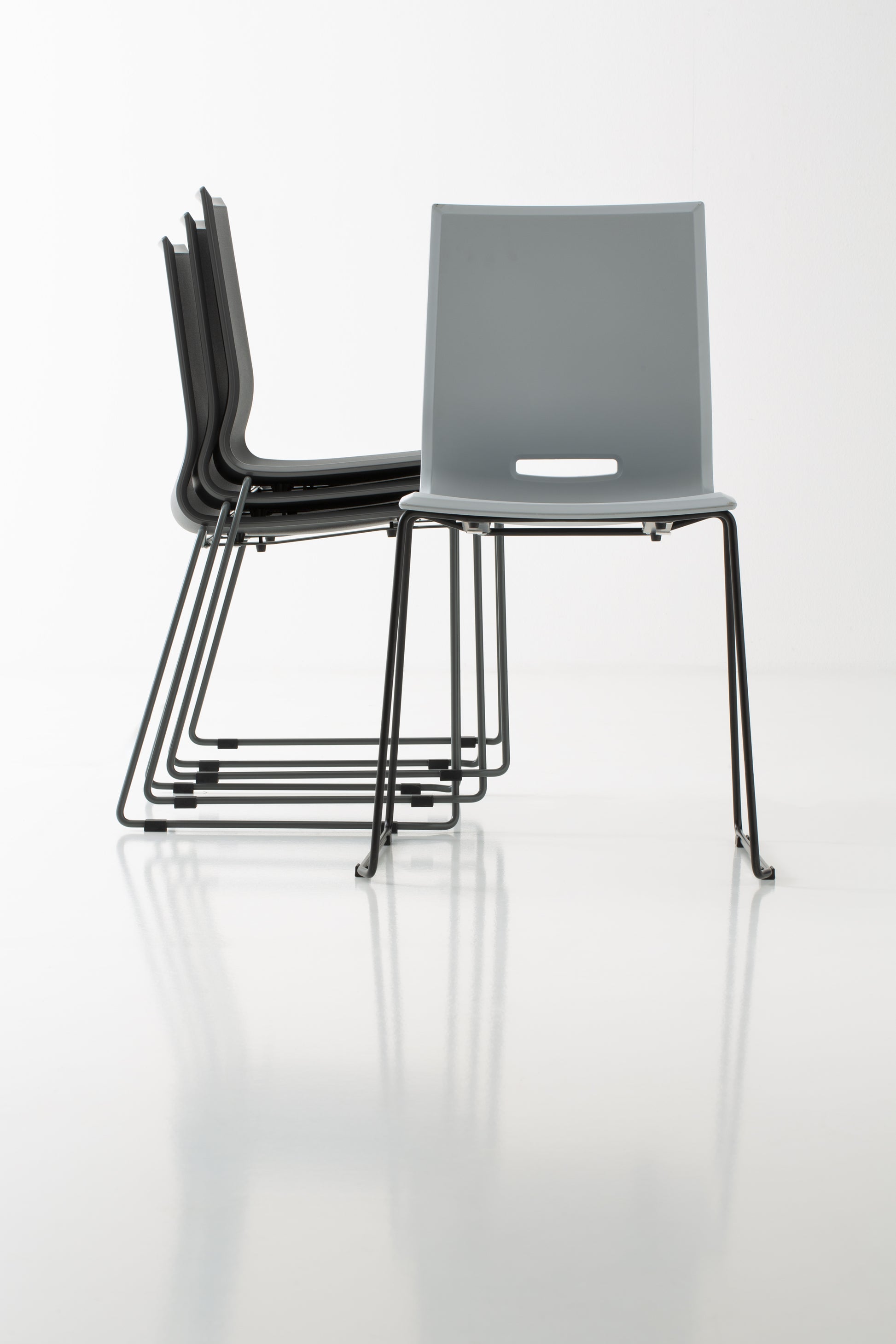 Sedia dalle forme essenziali, con scocca in polipropilene rinforzato con fibra di vetro e struttura in metallo verniciato, anche impilabile.