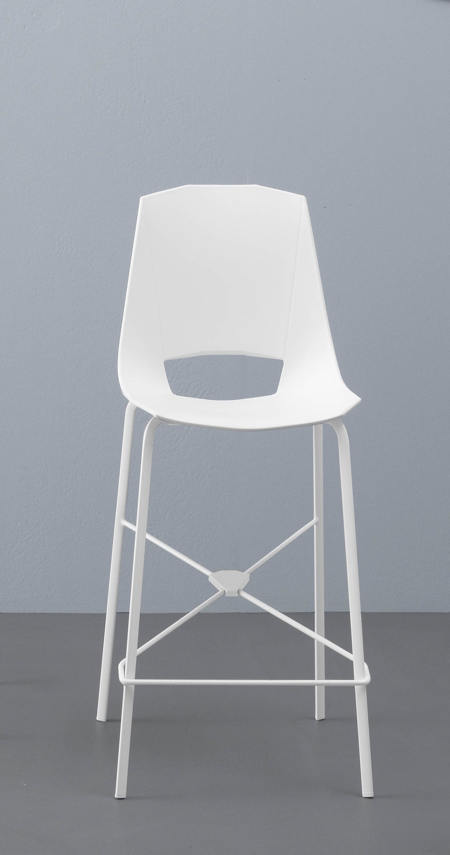 Eva è disponibile in versione sgabello, con il fusto in tubolare a sezione triangolare.