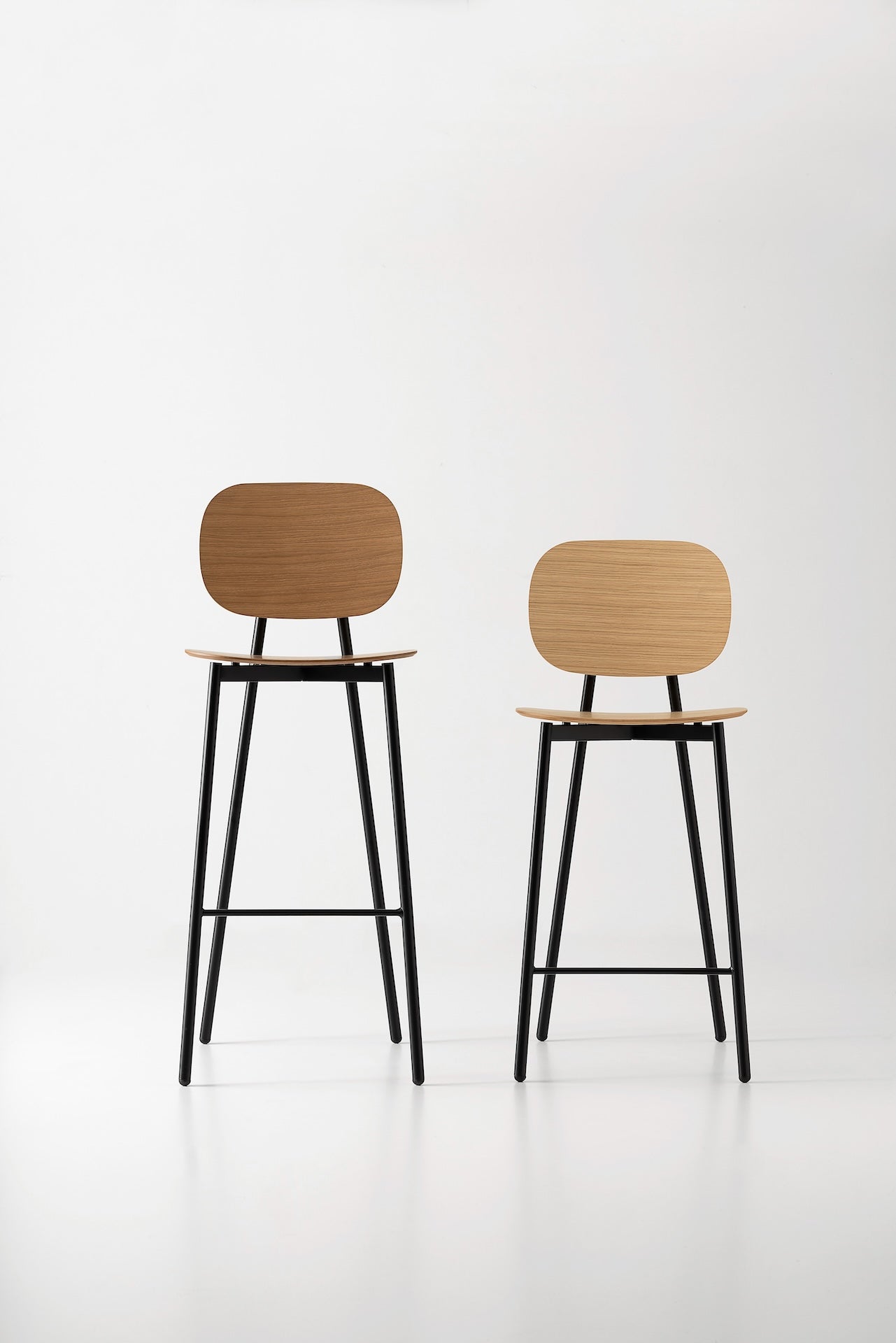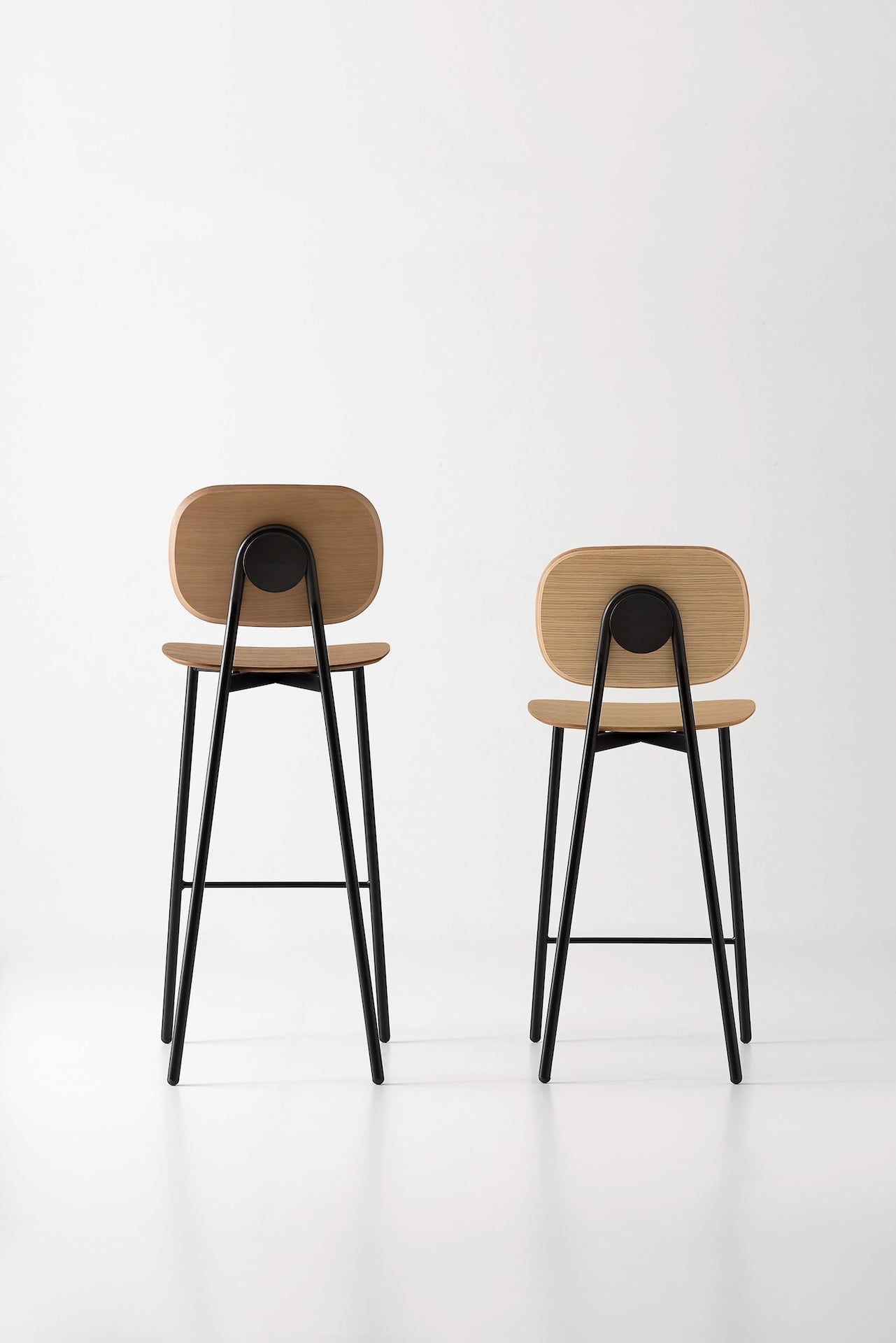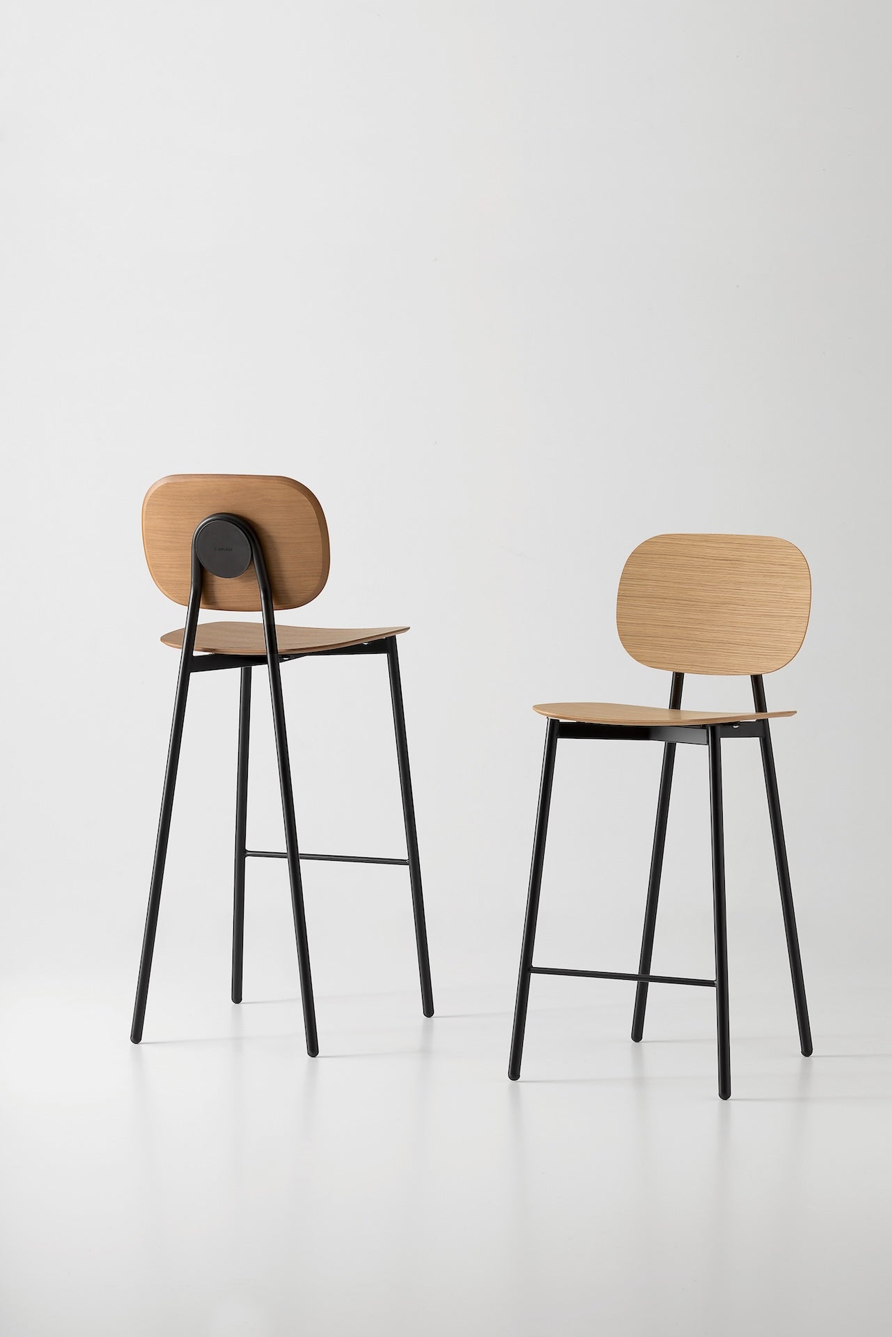 Sgabello con struttura tubolare rotonda. Disponibile con sedile e schienale impiallacciati
