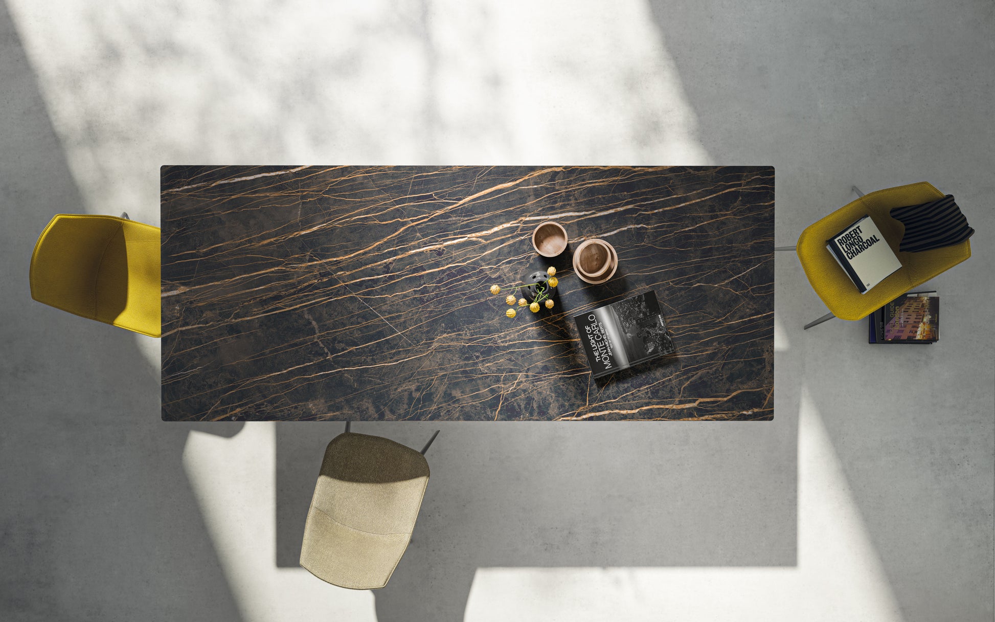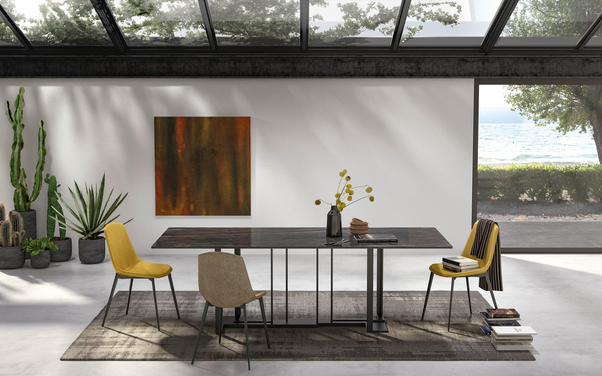 Accademia: maestria artigianale ed estetica. Tavolo con struttura metallica realizzata in tubolare a sezione rettangolare e ottone saldato a mano per la creazione di una struttura metallica unica dallo stile industriale. Lo stile industriale si esprime pienamente attraverso l'uso audace dei materiali e la cura dei dettagli. La struttura metallica è stata modellata con precisione, creando linee pulite e angoli distinti che catturano l'essenza dell'estetica industriale. Accademia è un incontro di materiali, forme e lavorazioni che si fondono in una sinfonia visiva e tattile per coloro che apprezzano la bellezza senza tempo.
