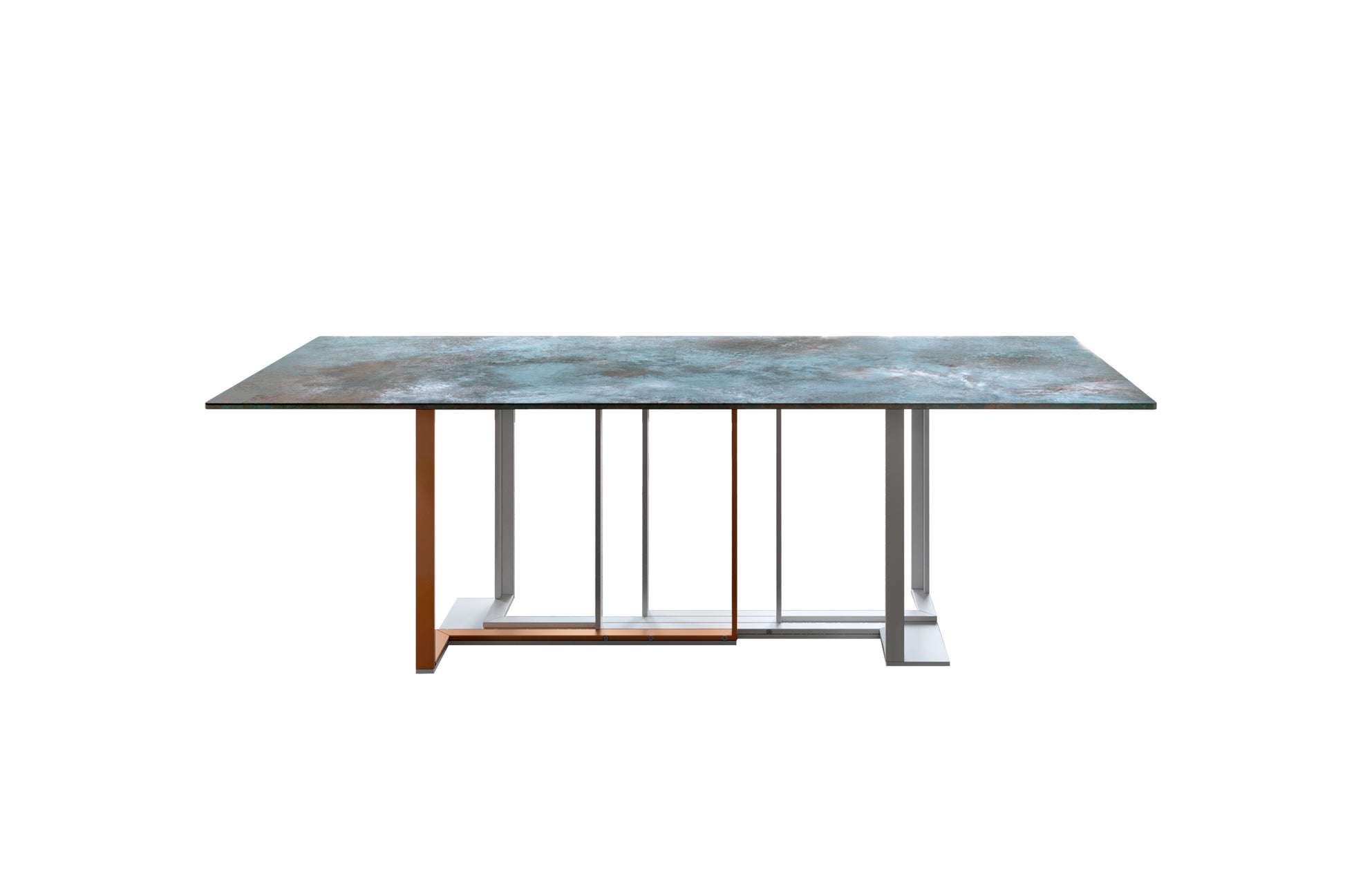Accademia: maestria artigianale ed estetica. Tavolo con struttura metallica realizzata in tubolare a sezione rettangolare e ottone saldato a mano per la creazione di una struttura metallica unica dallo stile industriale. Lo stile industriale si esprime pienamente attraverso l'uso audace dei materiali e la cura dei dettagli. La struttura metallica è stata modellata con precisione, creando linee pulite e angoli distinti che catturano l'essenza dell'estetica industriale. Accademia è un incontro di materiali, forme e lavorazioni che si fondono in una sinfonia visiva e tattile per coloro che apprezzano la bellezza senza tempo.