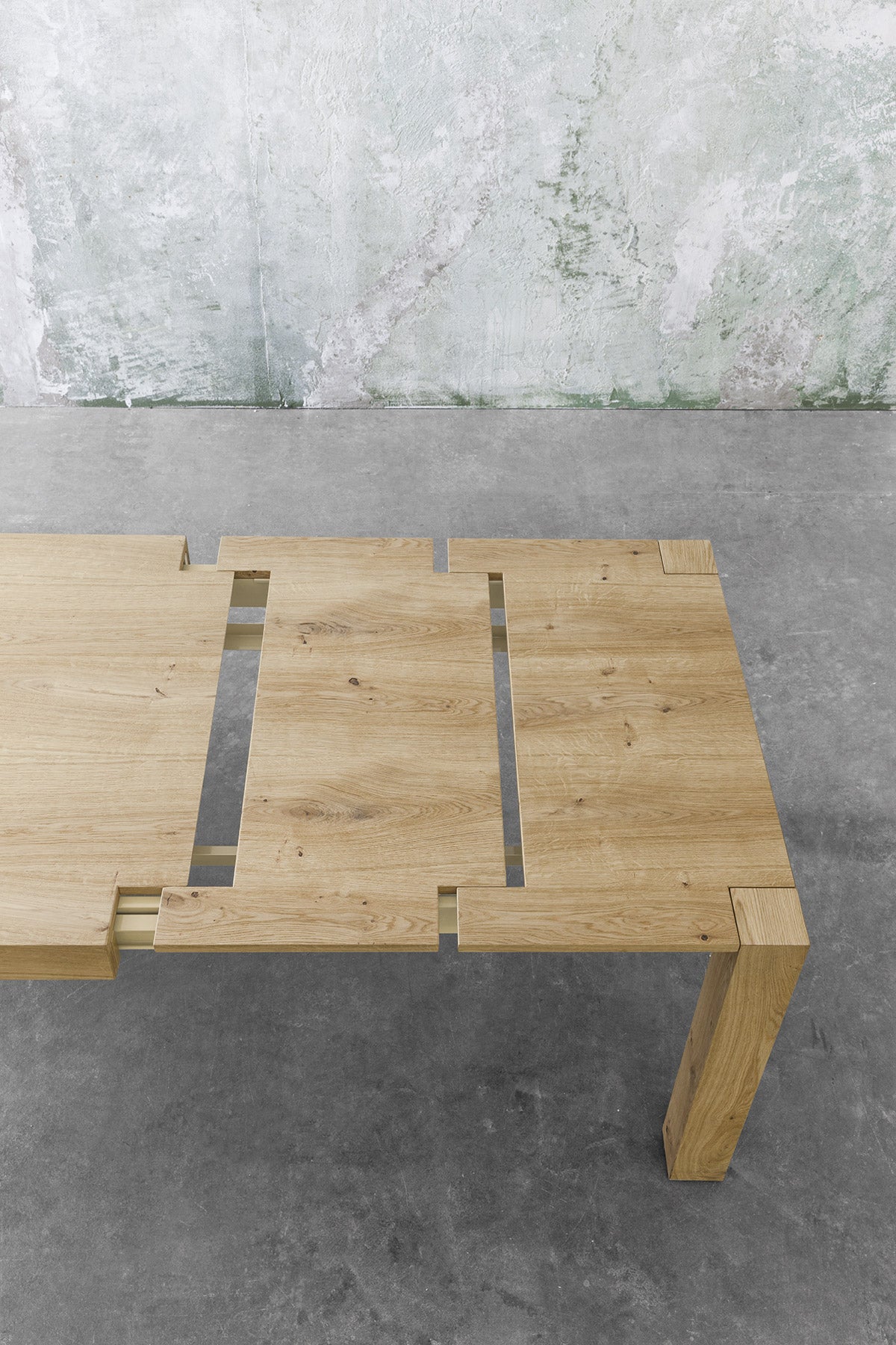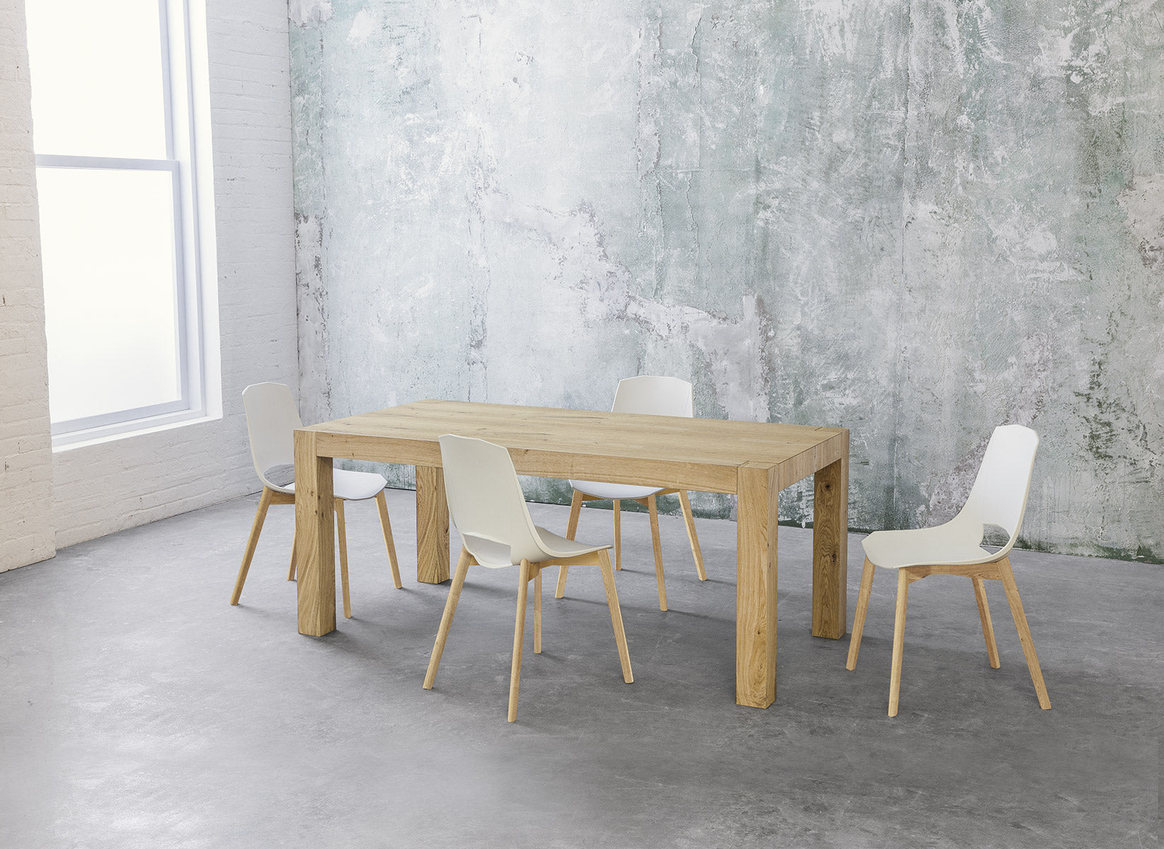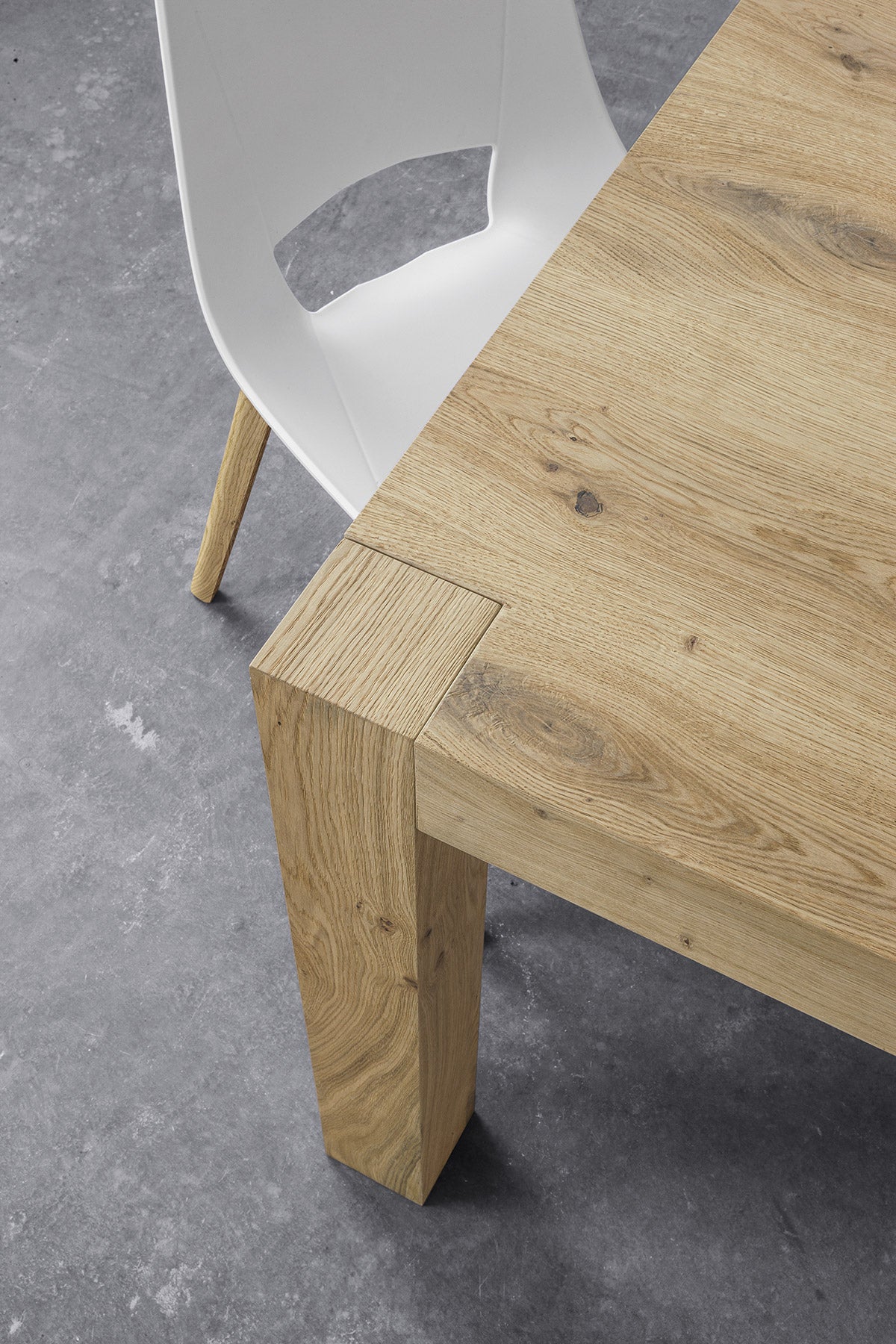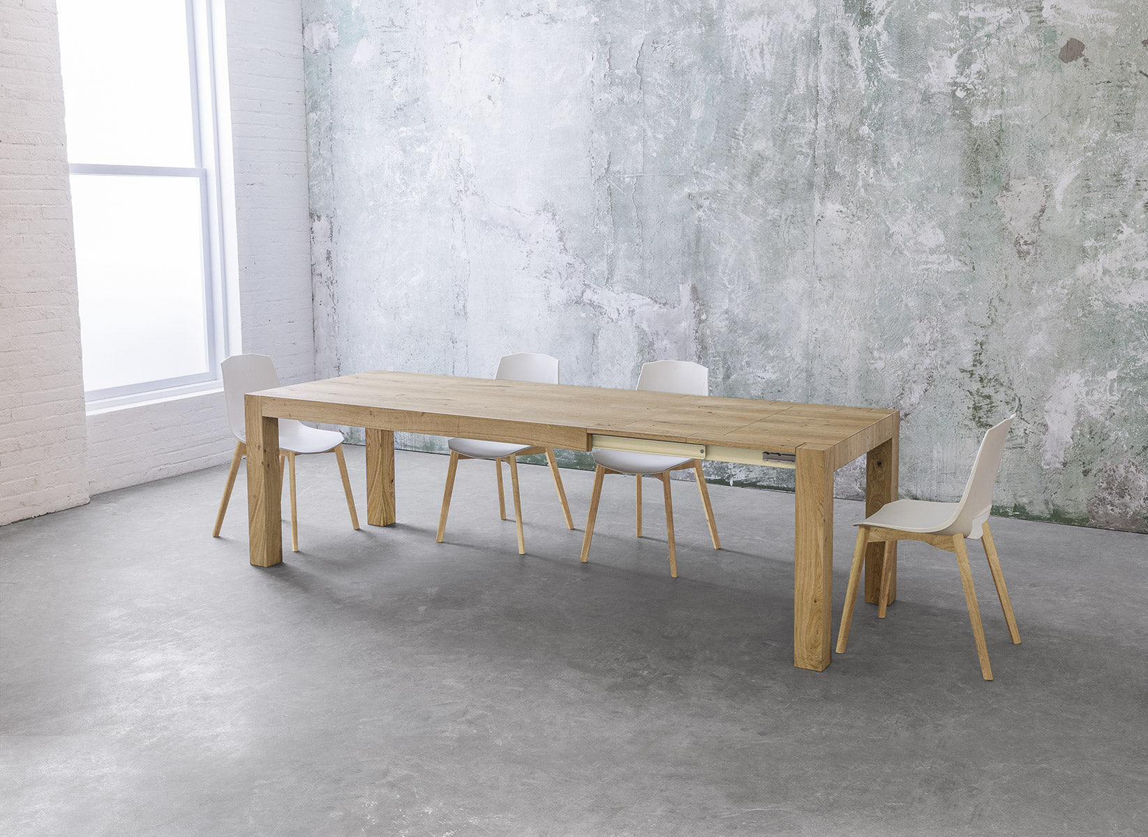 Tavolo allungabile in legno impiallacciato rovere nodato, supportato al suo intenro da un telaio in metallo verniciato a polveri epossidiche. Le gambe sono dotate di un dispositivo brevettato di ruote a scomparsa Click- Clack, che agevolano l’apertura del tavolo. Disponibile con due allunghe da 40 cm e nella versione Long con tre allunghe da 40cm.