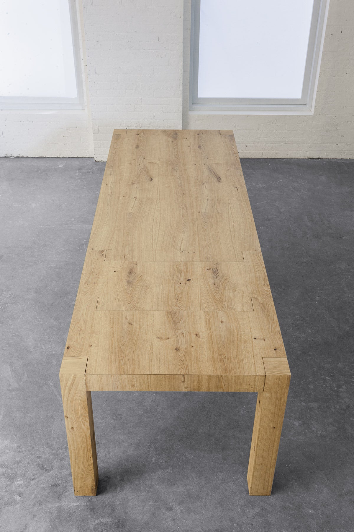 Tavolo allungabile in legno impiallacciato rovere nodato.