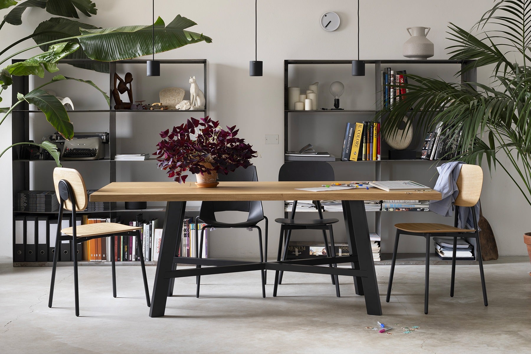 Il tavolo ha una base centrale realizzata in tubolare di acciaio rettangolare, caratterizzata da precisi incastri ottenuti tramite taglio laser. Questa tecnologia conferisce alla base un'estetica distintiva con giunti a vista, evidenziando la precisione e la cura nella sua realizzazione.