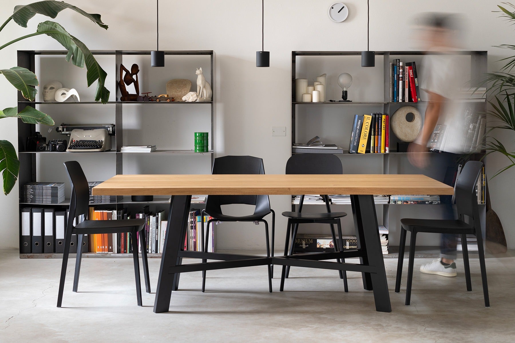 Il piano, con uno spessore di 40 mm, offre una gamma di opzioni per soddisfare diverse preferenze estetiche. Puoi scegliere tra impiallacciatura di rovere nodato per un aspetto classico e caldo, un piano in legno massello sagomato con effetto tronco per una sensazione di natura e rusticità, o un elegante combinazione di gres accoppiato al vetrocon spessore 18 mm, che conferisce al tavolo un aspetto contemporaneo e raffinato.