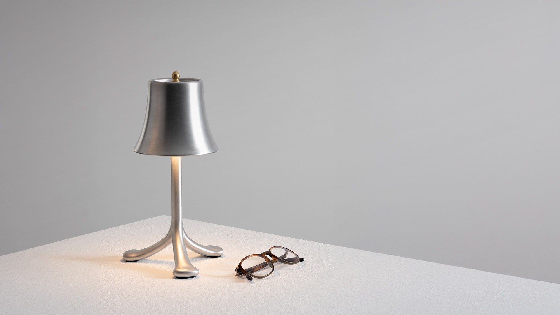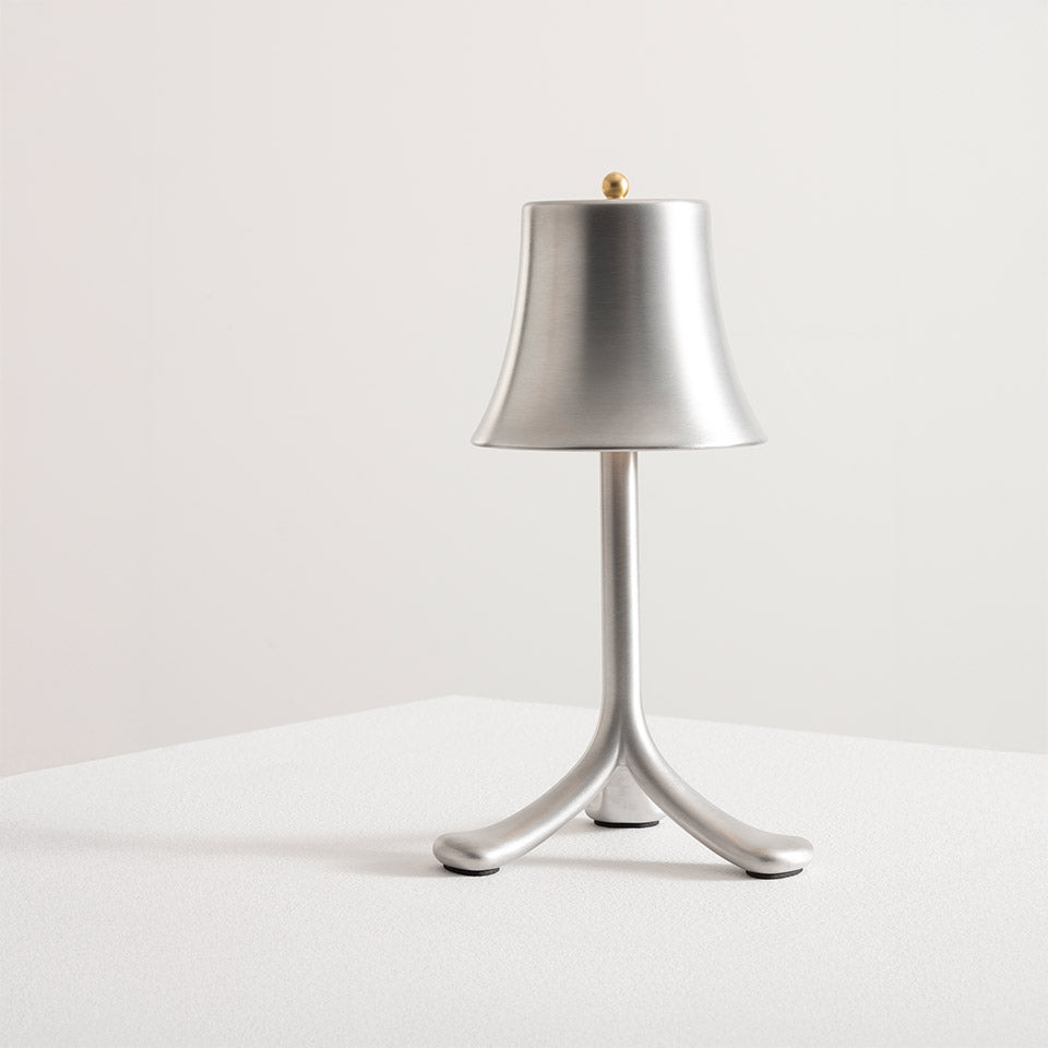 Complesse soluzioni tecniche e una profonda conoscenza della lavorazione dei tessuti si uniscono per dare vita a questa lampada portatile, ricaricabile e dimmerabile, dal carattere giocoso. È disponibile anche in una versione in alluminio pressofuso, adatta ad ambienti più dinamici. Il diffusore ospita la sorgente luminosa, i componenti elettronici e la batteria, diffondendo una luce morbida sotto il paralume. Il punto d’incontro tra le tre gambe nasconde con discrezione la porta di ricarica, mentre un elemento in ottone sulla parte superiore consente di accendere la lampada e regolare l’intensità luminosa con un semplice tocco.